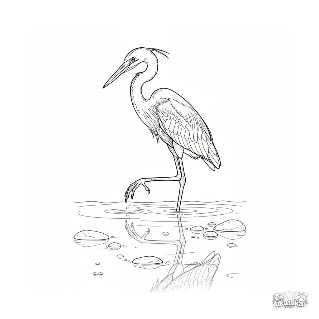 Ausmalbild für ältere Kinder 10-12: Ein grauer Reiher steht still im flachen Wasser eines klaren Baches, sein Spiegelbild ist sichtbar, auf der Lauer nach Beute.