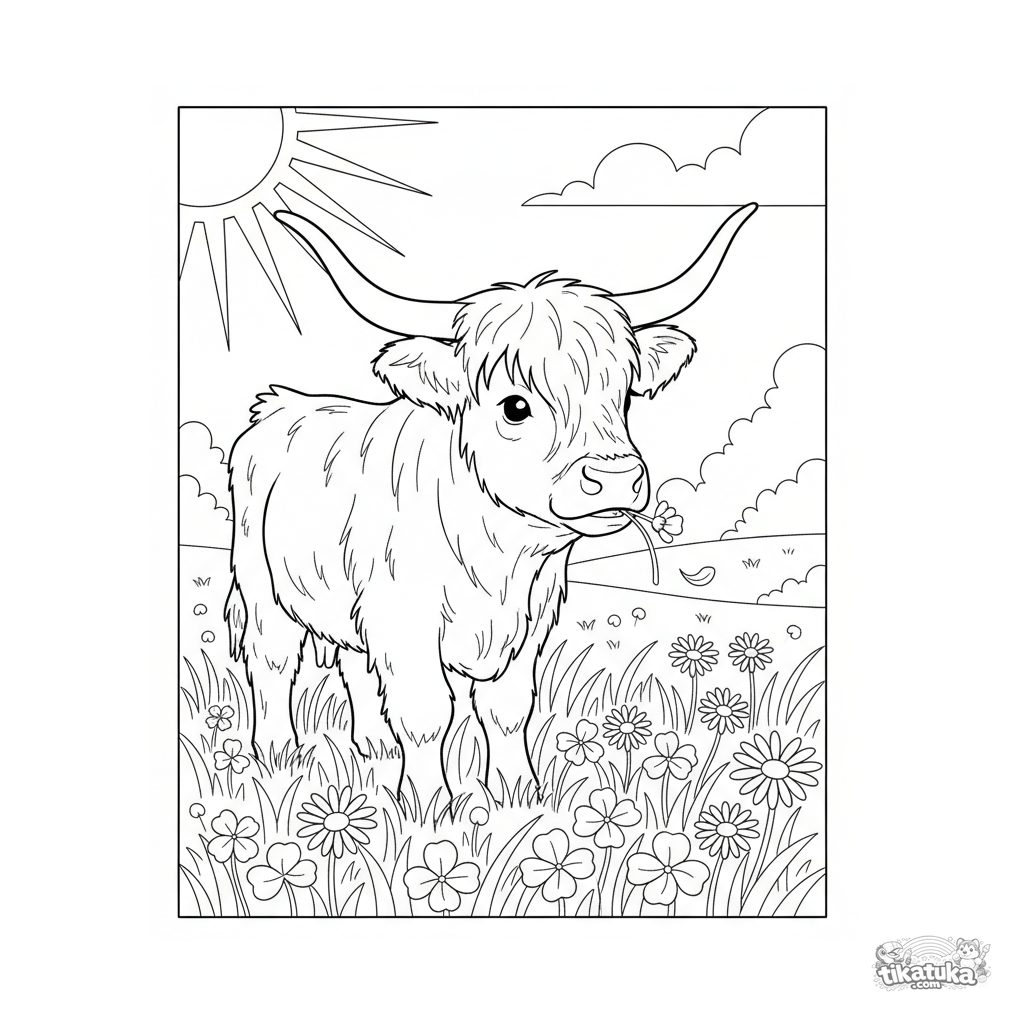 Kinder-Ausmalbild: ein flauschiges Highland-Kalb weidet auf einer sonnigen Frühlingswiese mit Klee und Gänseblümchen. Ganzer Körper sichtbar mit klaren Umrissen.