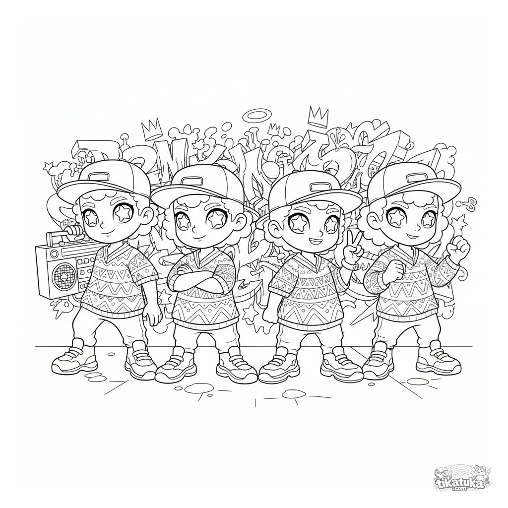 Ausmalbild für Kinder von 7-12 Jahren: Eine Hip-Hop-Crew in stylischer Streetwear posiert selbstbewusst vor einem großen Graffiti-Mural mit einer Boombox. Szene mit detaillierten Outfits und Kameradschaft.