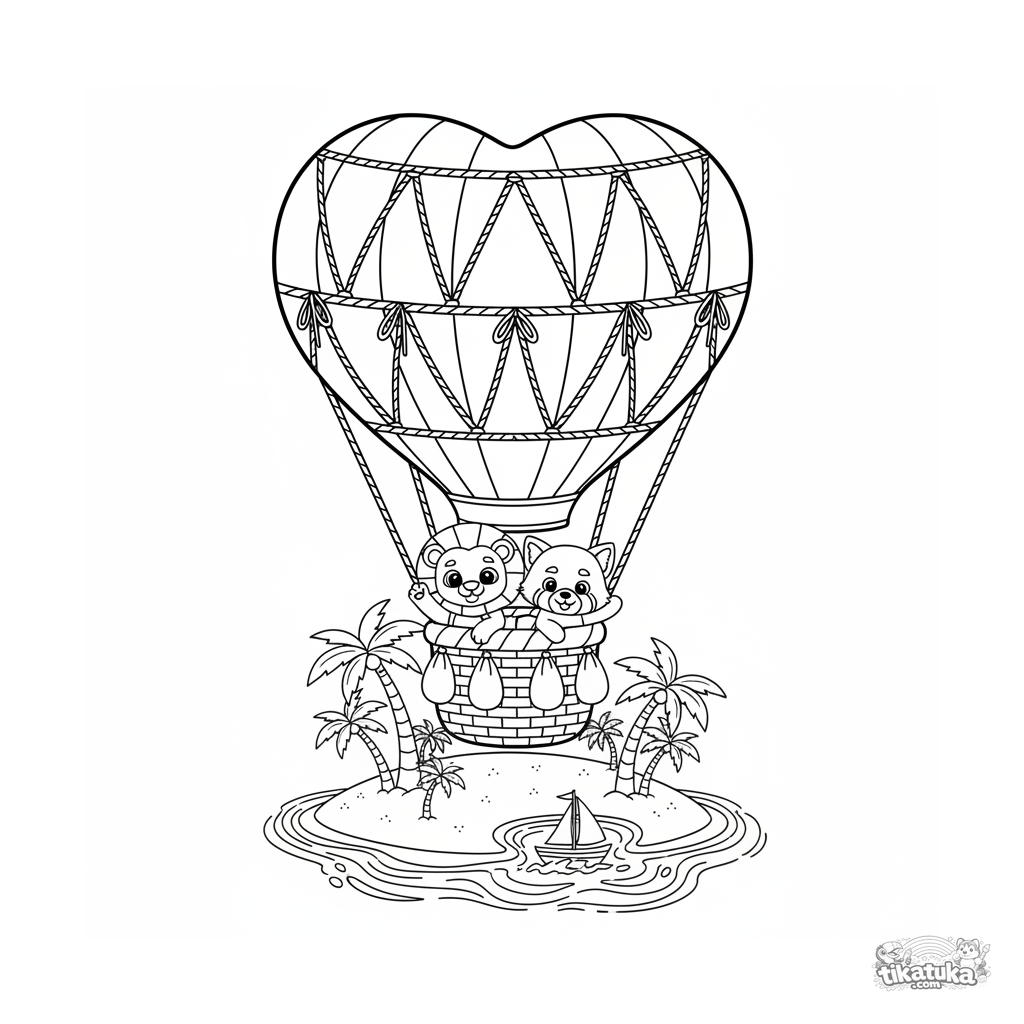 Ausmalbild für Kinder 4-6: Ein herzförmiger Heißluftballon schwebt über einer idyllischen Tropeninsel. Weiche Linien, märchenhafte Atmosphäre.