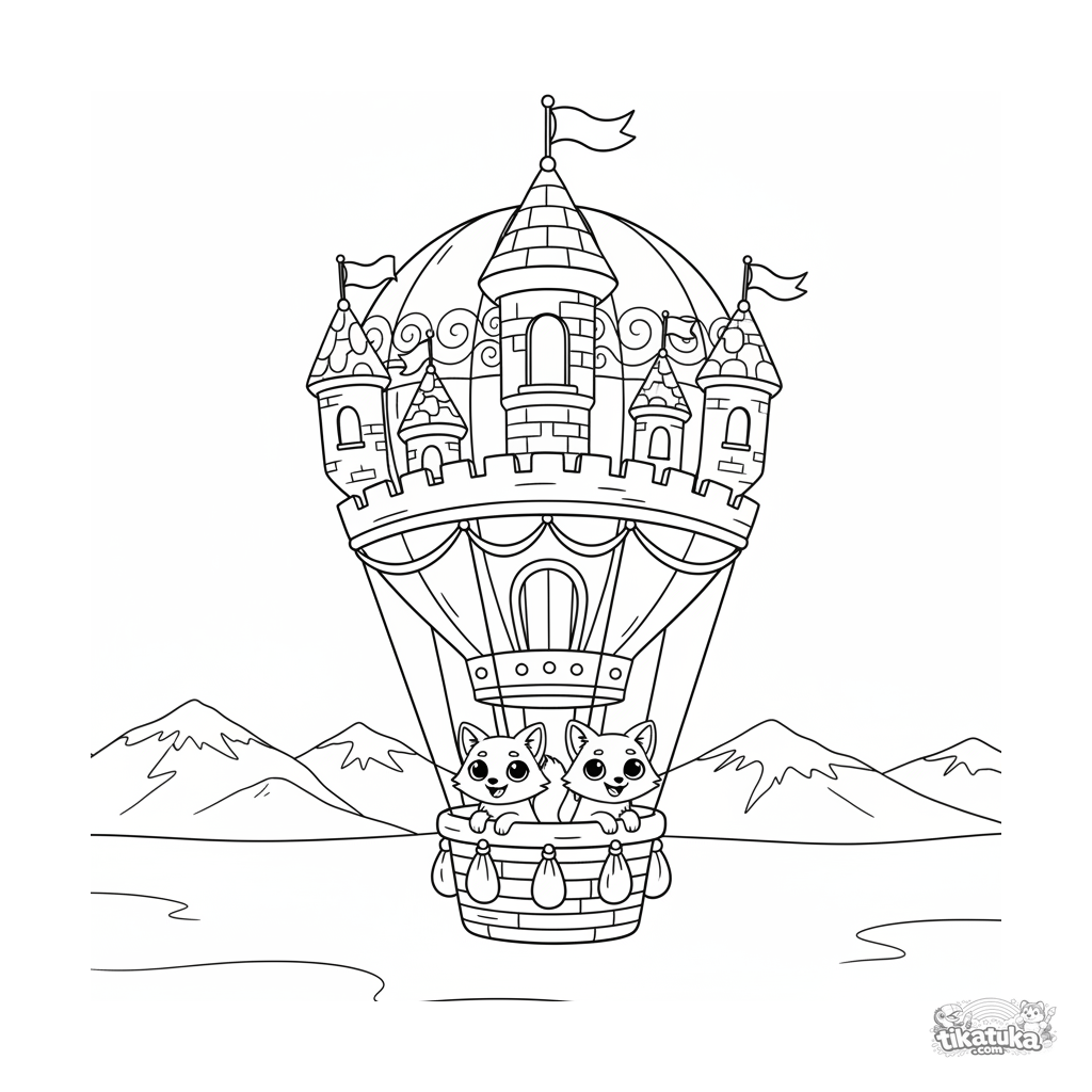 Ausmalbild eines magischen, schlossförmigen Heißluftballons, der über einer schneebedeckten Tundra schwebt. Für Kinder von 4-6 Jahren. Passagiere sind Polarfüchse im Korb.