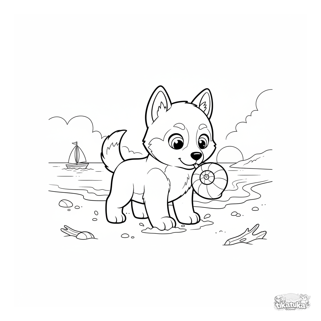 Kinder Ausmalbild: Husky-Welpe Lutik erkundet neugierig den Strand und hat eine große, schöne Muschel am Wasserrand gefunden. Strandthema.