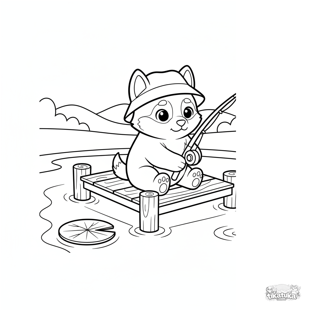 Ausmalbild für Kinder: Ein Husky-Welpe mit einer Angelrute sitzt auf einem Holzsteg an einem Teich. Ruhige Szene zum Ausmalen.