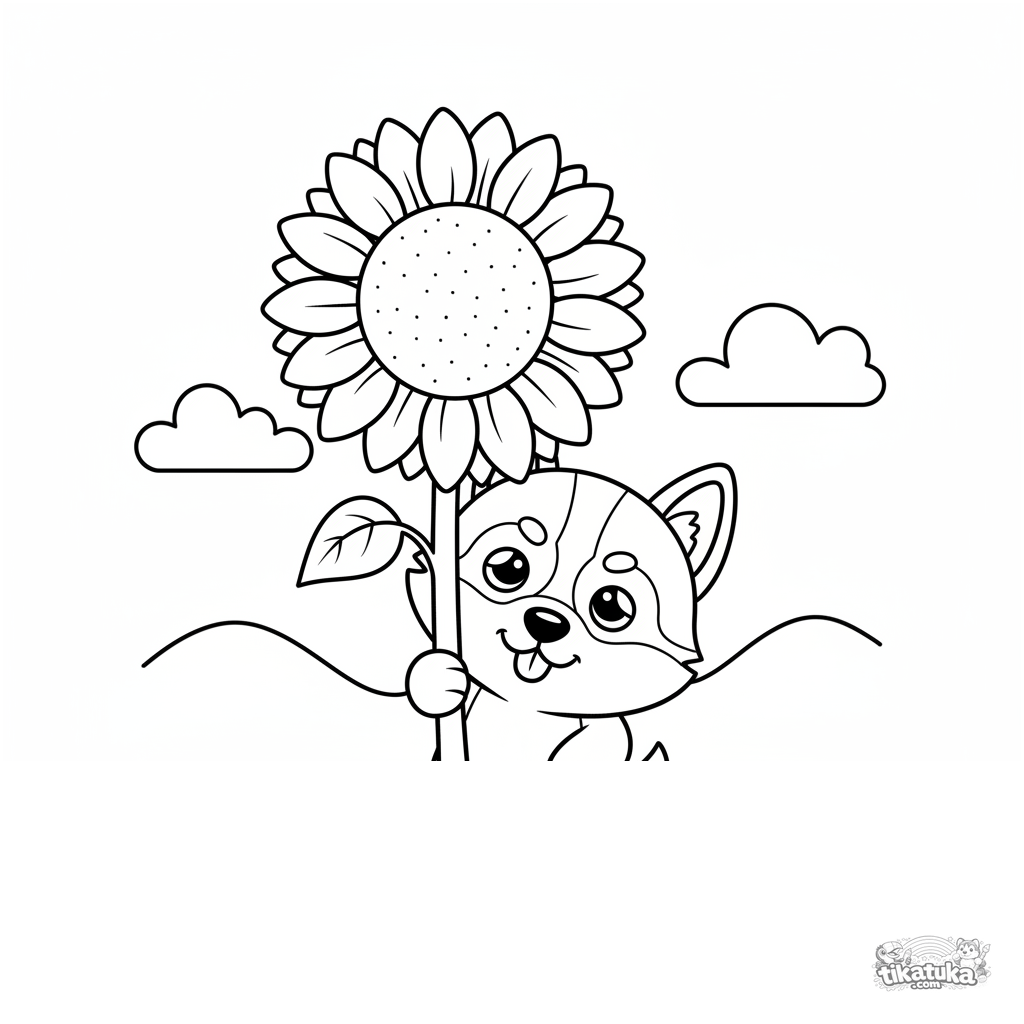 Ausmalbild für Kinder: Ein Husky-Welpe spielt Verstecken und lugt hinter einer hohen Sonnenblume auf einem Feld hervor. Lustige Szene.