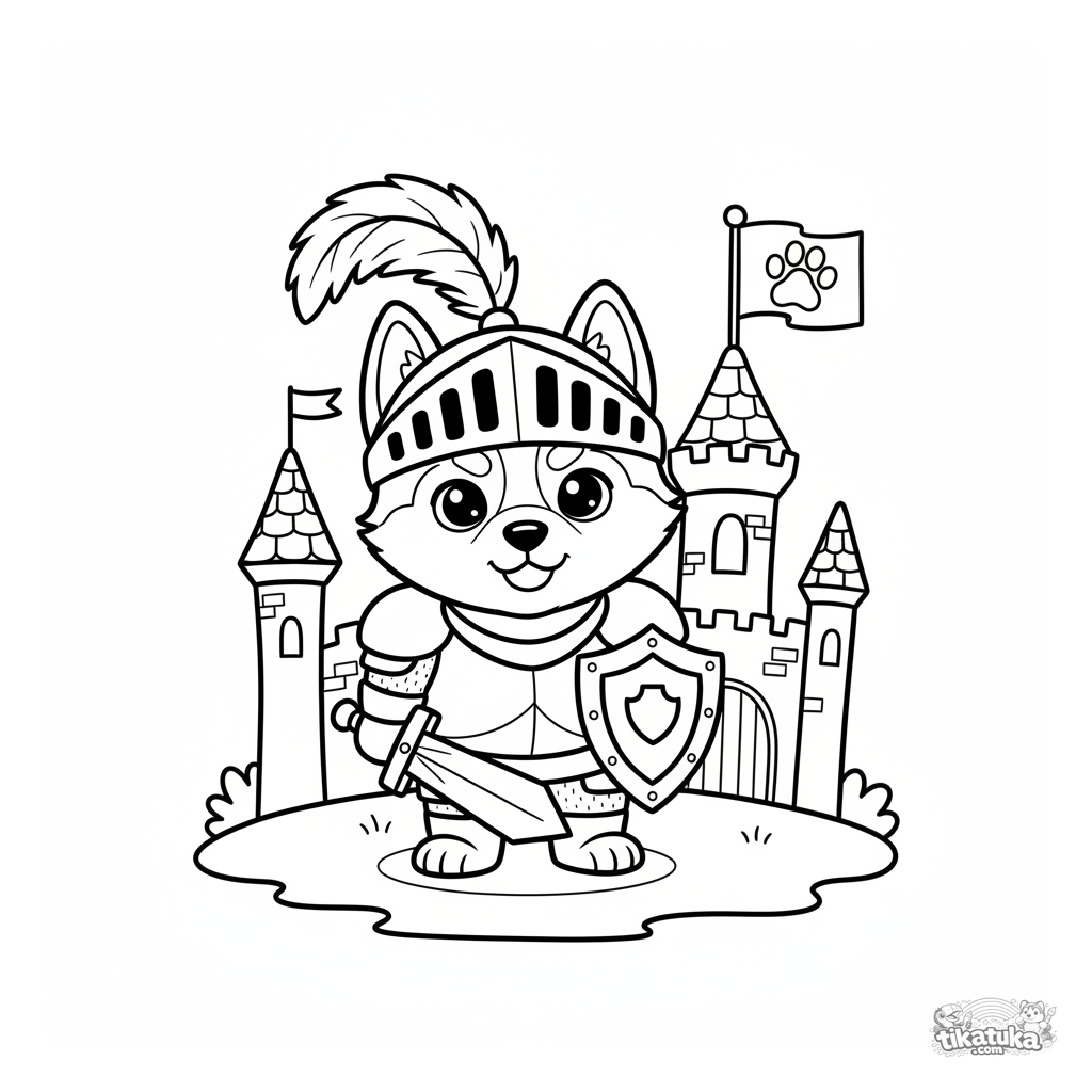 Ausmalbild für Jungen: Ein Husky-Ritter in Rüstung bewacht ein Spielzeugschloss. Skandinavischer Spielzeugstil, klare Umrisse, für Kinder von 4-7 Jahren.