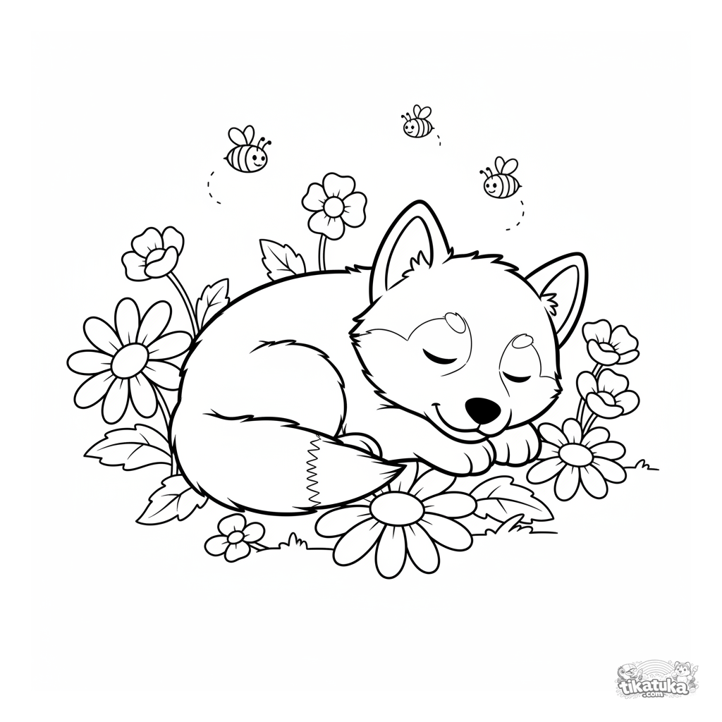 Einfaches Ausmalbild für Kleinkinder 2-3: Süßer Husky-Welpe Lutik schläft fest, zusammengerollt zwischen Blumen auf einer Wiese. Große Formen, wenige Details.