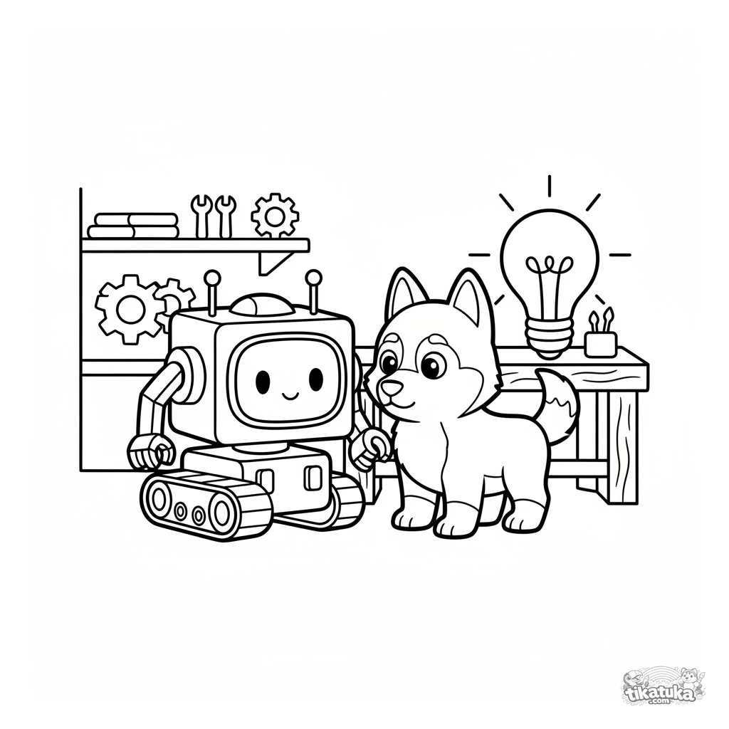 Ausmalbild für Kleinkinder: Husky Lutik und ein freundlicher Roboter in einer gemütlichen Werkstatt. Große einfache Formen, wenige Details, für 2-3 Jahre.