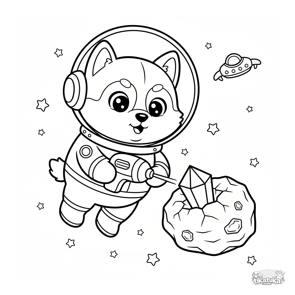 Ausmalbild für Kinder 4-6: Husky Lutik in einem Raumanzug fördert Kristalle auf einem Asteroiden im Weltraum. Einfache Linien, eine fantastische Szene.