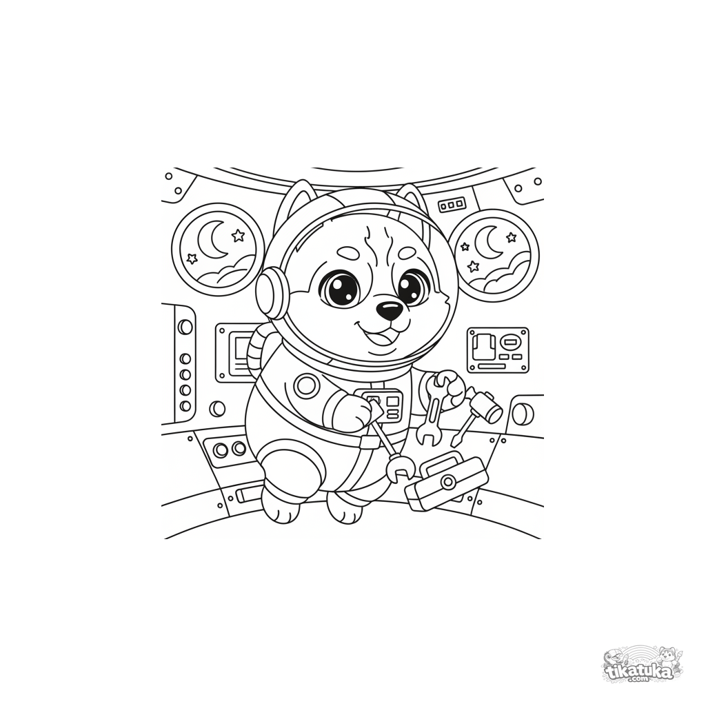 Husky-Astronaut Ausmalbild für Kinder. Ein Plüschwelpe im Raumanzug schwebt in einer Raumstation.