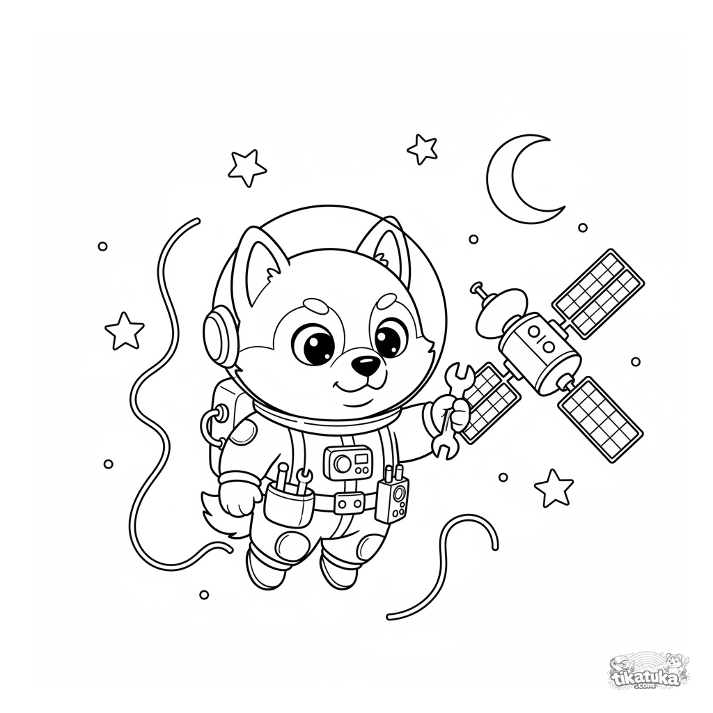 Ausmalbild eines Husky-Astronauten für Kinder von 4-6 Jahren. Ein Welpe im Raumanzug repariert einen Satelliten mit einem Schraubenschlüssel.