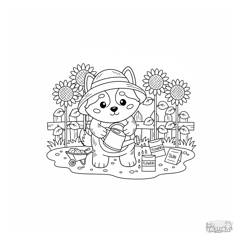 Kinder-Ausmalbild eines Husky-Gärtners. Ein Plüschwelpe mit Hut gießt Sonnenblumen. Einfache Gartenszene.