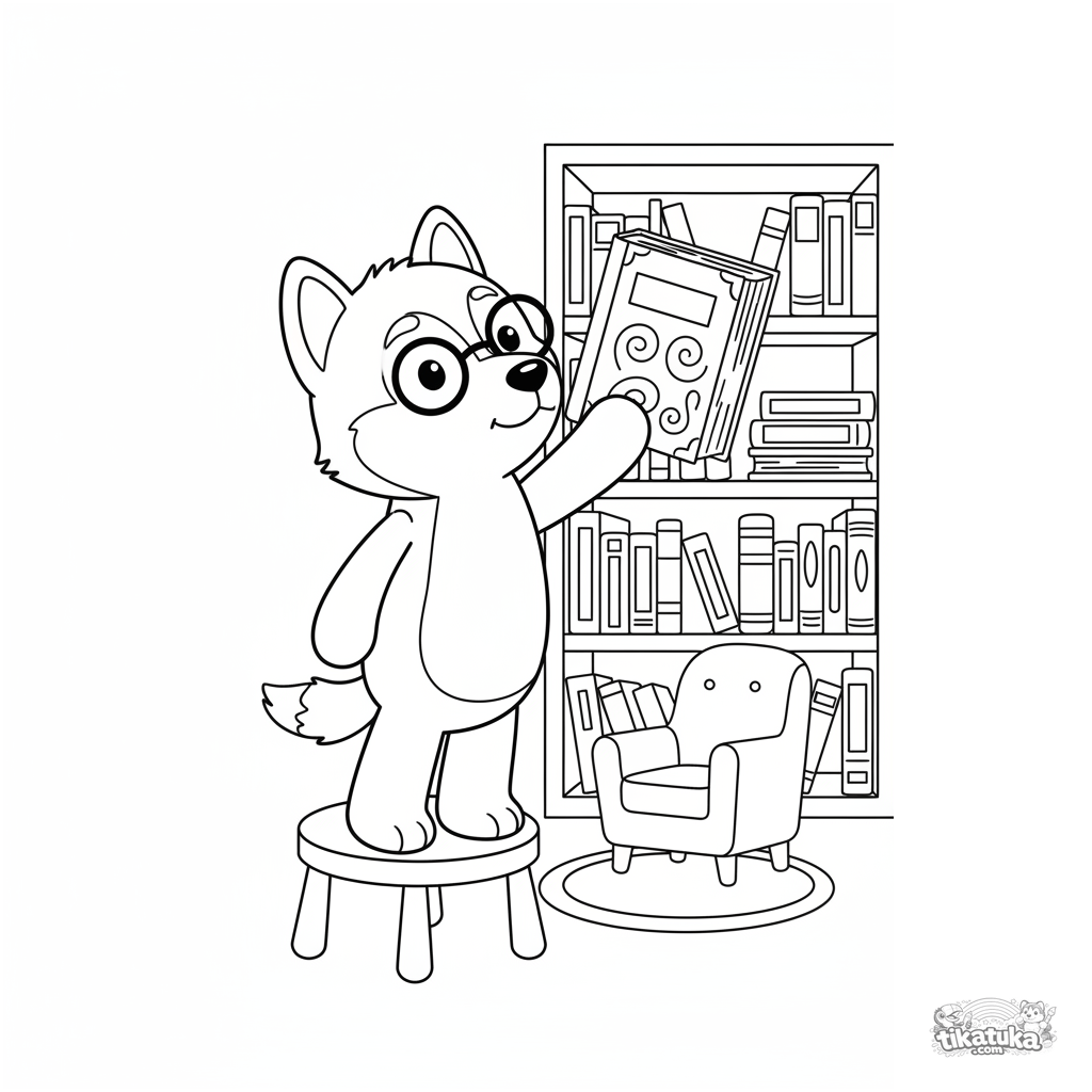 Ausmalbild mit einem Husky-Bibliothekar. Kinder-Ausmalbild für 4-6 Jahre. Ein Plüschwelpe räumt Bücher in einer gemütlichen Bibliothek ein.