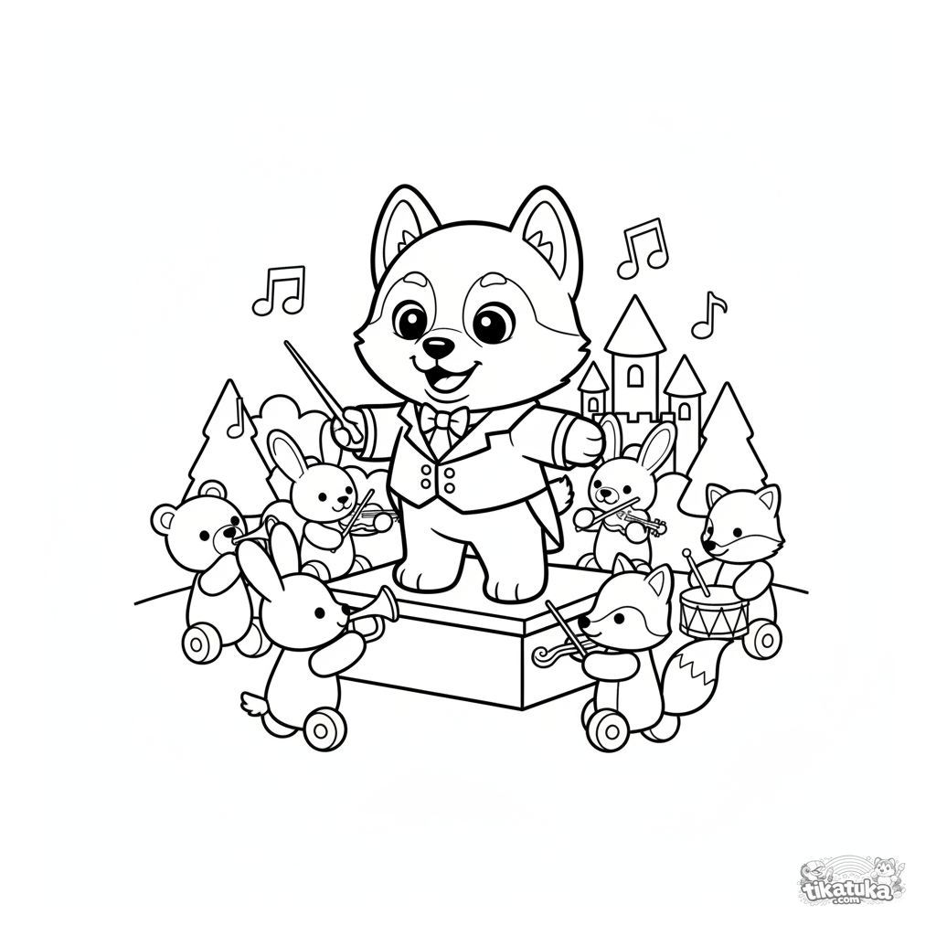 Ausmalbild mit einem Husky-Dirigenten. Kinder-Ausmalbild für 4-6 Jahre. Ein Plüschwelpe dirigiert ein Spielzeugorchester auf einer Bühne.