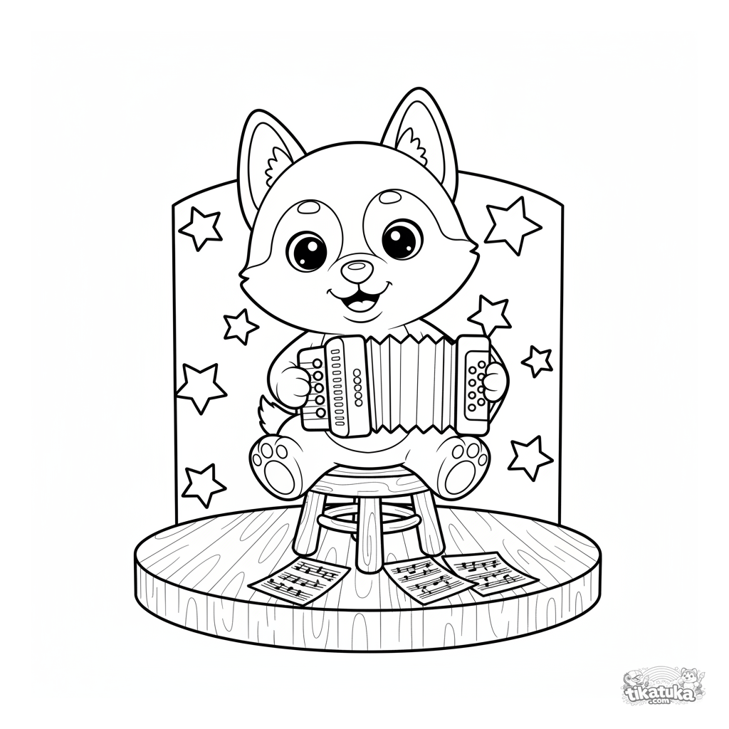 Ausmalbild eines Husky-Musikers für Kinder. Ein Plüschwelpe spielt Akkordeon auf der Bühne. Einfache Linien, niedlicher Ausdruck.