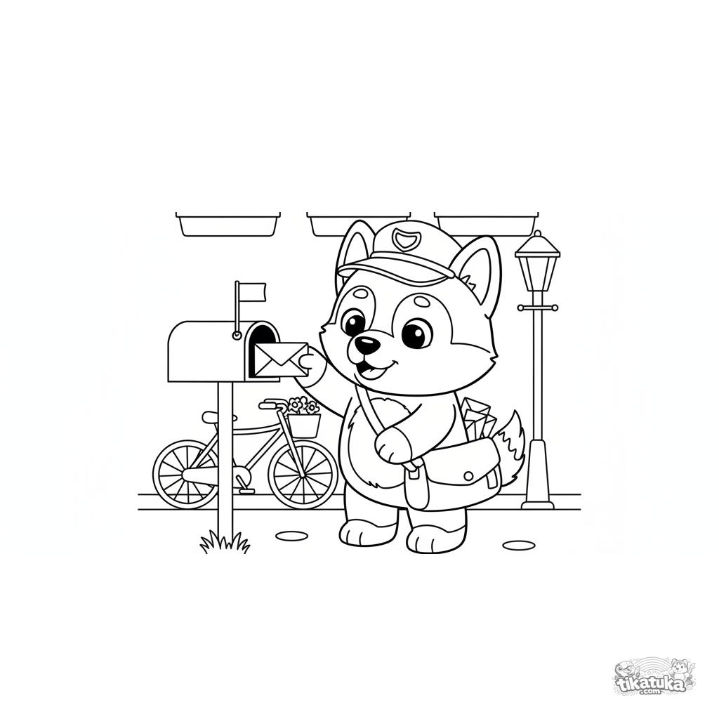 Ausmalbild mit einem Husky-Postboten. Kinder-Ausmalbild für 4-6 Jahre. Ein Plüschwelpe bringt Briefe zu einem Briefkasten auf der Straße.