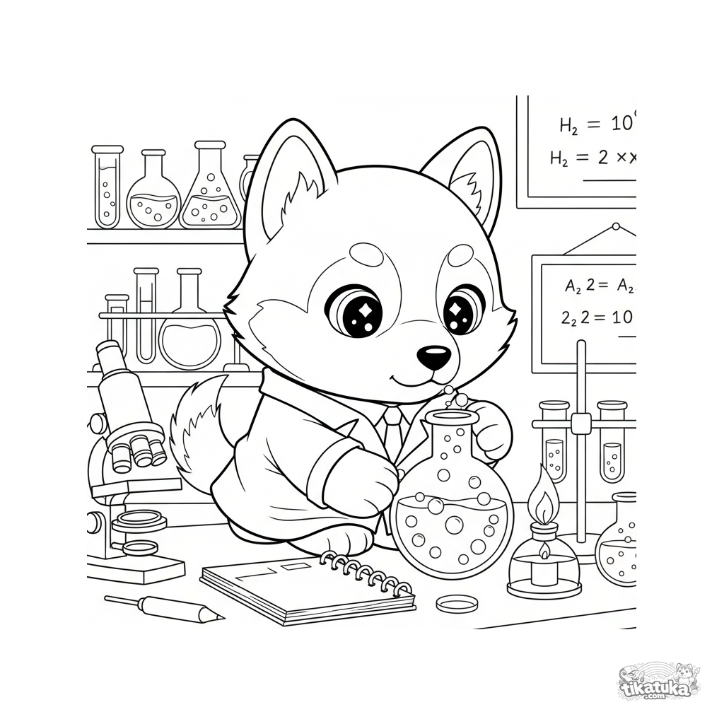Ausmalbild mit einem Husky-Wissenschaftler. Kinder-Ausmalbild für 4-6 Jahre. Ein Plüschwelpe führt ein Experiment in einem Wissenschaftslabor durch.