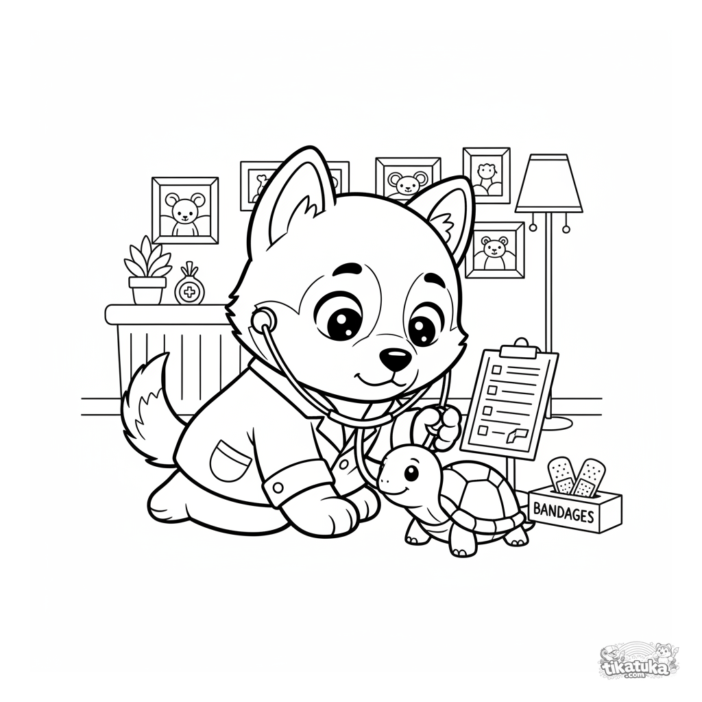 Ausmalbild eines Husky-Tierarztes für Kinder von 4-6 Jahren. Ein Welpe im weißen Kittel hört einer Schildkröte mit einem Stethoskop zu.