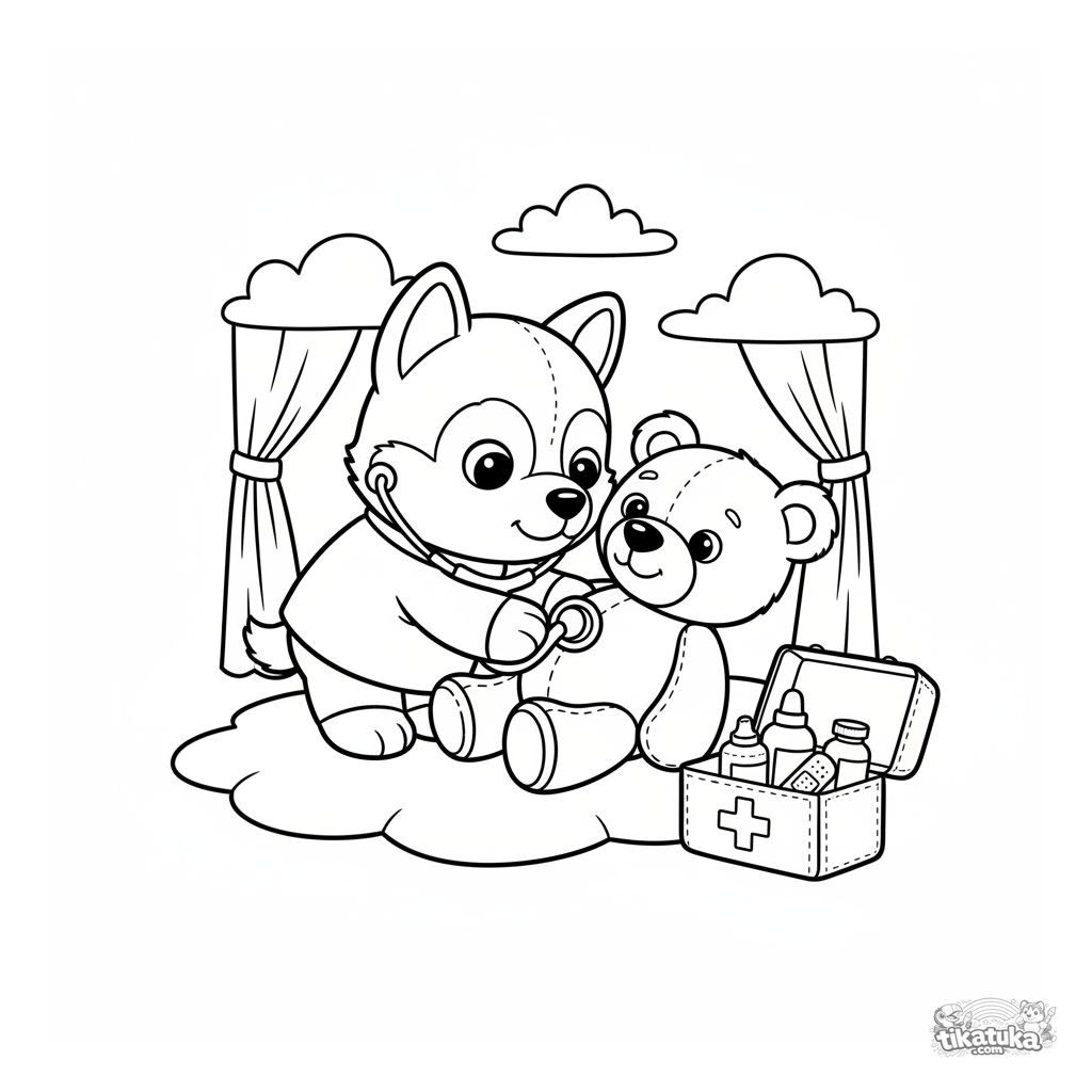 Ausmalbild eines Husky-Tierarztes für Kinder. Ein Plüschwelpe im weißen Kittel behandelt einen Teddybären.