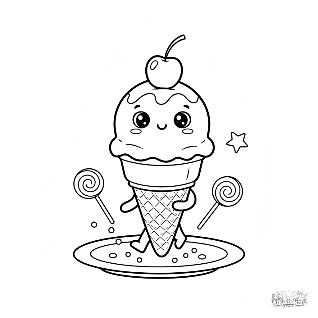 Kinder-Ausmalbild: Eine Eiskugel in einem Waffelhörnchen marschiert über einen Teller. Eine lustige Szene mit Streuseln und einer Kirsche für Kinder im Alter von 4-6 Jahren.