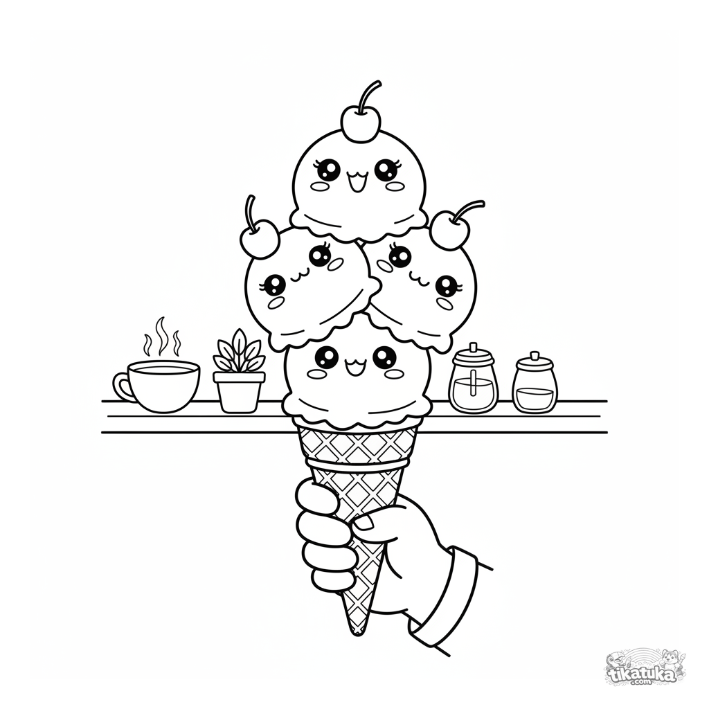 Ausmalbild für Kinder: Ein Trio Eiskugeln marschiert eine Waffel auf einem Café-Tresen hinauf. Niedliche und lustige Szene für Kinder von 4-6 Jahren.