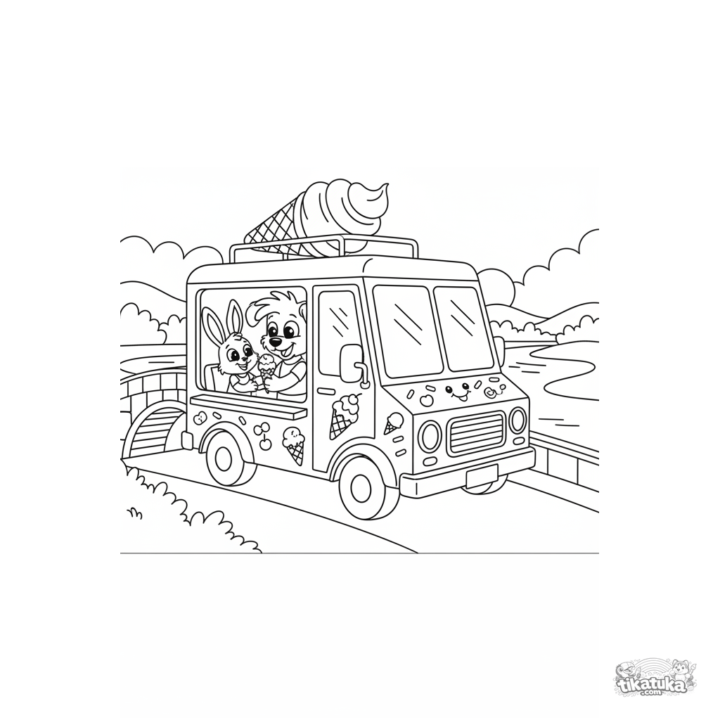 Lustiges Ausmalbild für Kinder 4-6: Ein heller Eiswagen steht auf einer Brücke. Szene mit Tierfiguren.