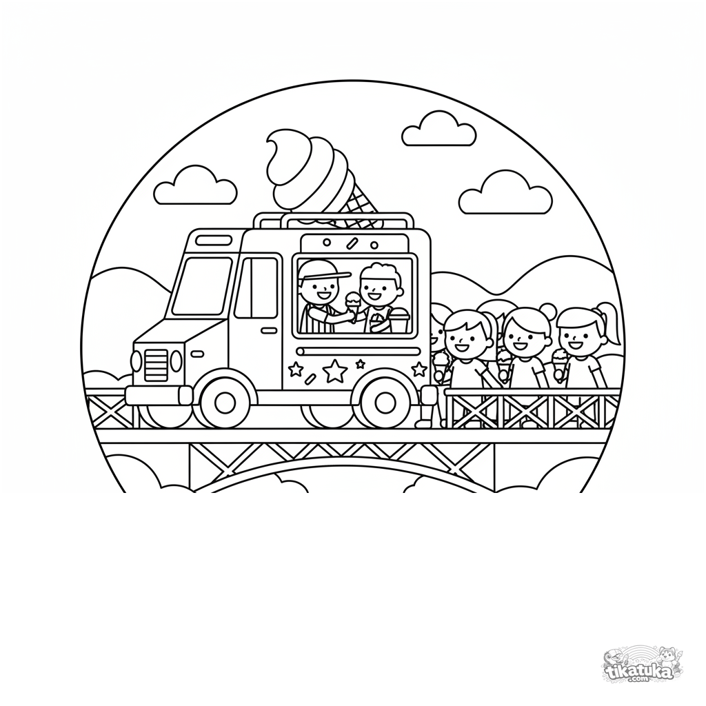 Helles Ausmalbild für Kinder 4-6: Ein fröhlicher Eiswagen hält auf einer Brücke über dem Fluss. Einfache flache Formen und eine glückliche Szene.