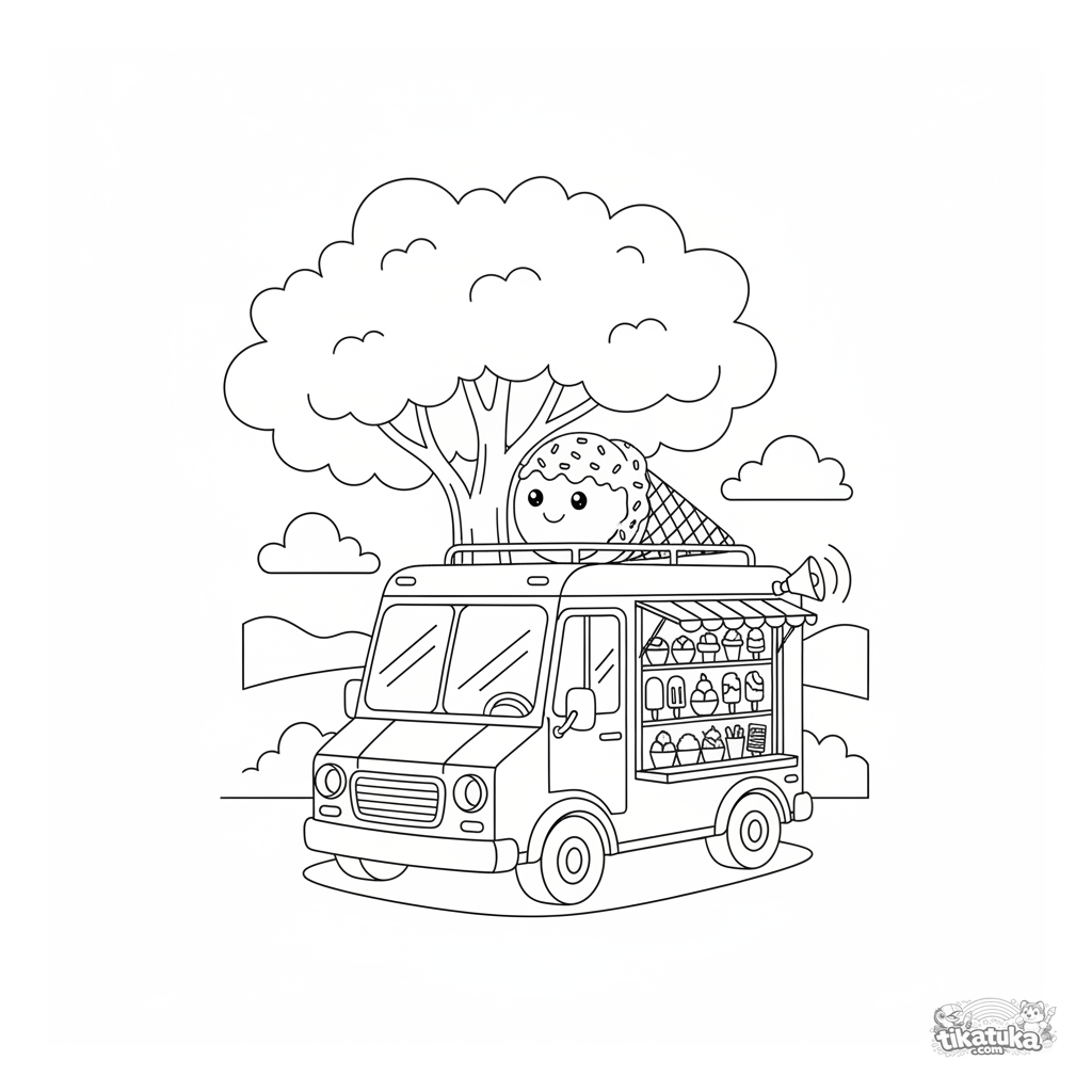 Ausmalbild für Jungen von 4 bis 6 Jahren. Ein fröhlicher Eiswagen mit einer lächelnden Waffel auf dem Dach. Eine sommerliche und appetitliche Szene.