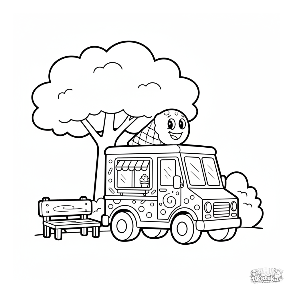Ausmalbild für Kleinkinder: ein fröhlicher Eiswagen im Park. Einfache Fahrzeugform mit einer großen Eistüte obenauf.