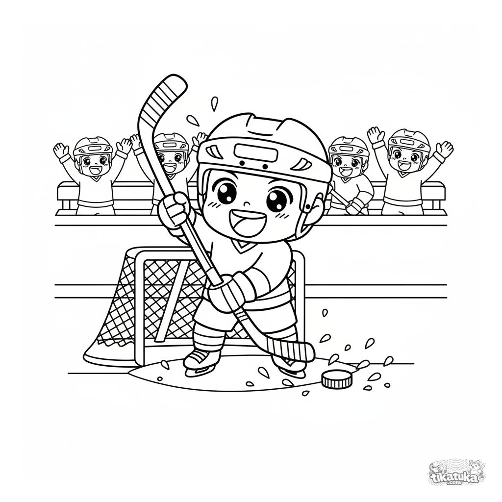 Ausmalbild für Kinder: Ein Hockeyspieler feiert ein Tor auf der Eisbahn. Für 4-6 Jahre, eine actionreiche und emotionale Szene.