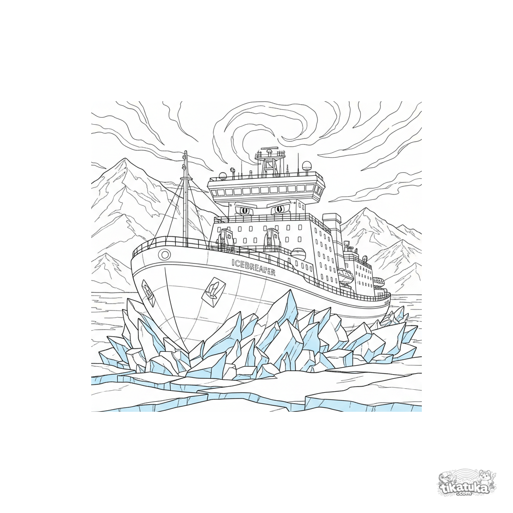 Detailliertes Ausmalbild für ältere Kinder 10-12: Ein mächtiges Eisbrecher-Schiff bricht durch Meereis in einem arktischen Fjord. Rumpfdetails, Eisschollen und Gebirgshintergrund.