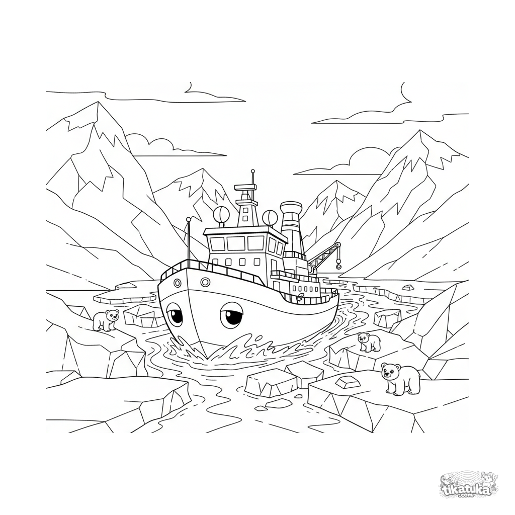 Ausmalbild für Kinder von 4-6 Jahren: ein starker Eisbrecher, der sich durch Eis schneidet. Geometrische Formen und eine interessante Szene.