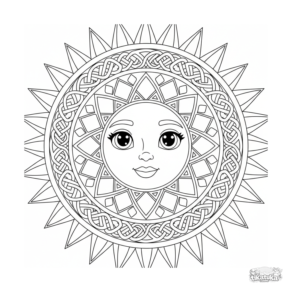 Komplexe geometrische Mandala-Ausmalbild für 10-12 Jahre. Achtfache Symmetrie, verschlungene Muster, keltische Knoten und Sonnenstrahlen—perfekt für detailliertes Ausmalen.
