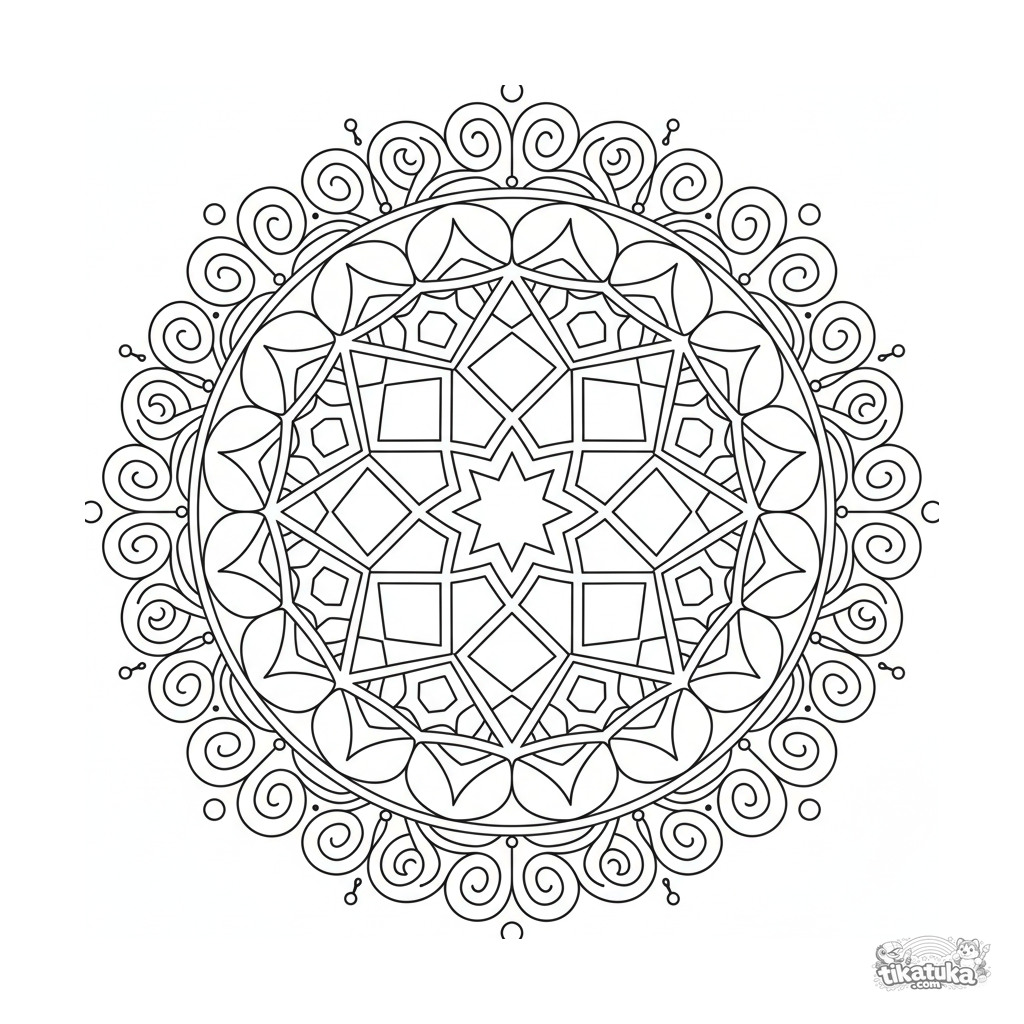 Komplexes geometrisches Mandala-Ausmalbild für Kinder von 10-12 Jahren. Zentrale achtzackiger Stern aus ineinandergreifenden Dreiecken, umgeben von Ringen aus Diamant- und Sechseckmustern.