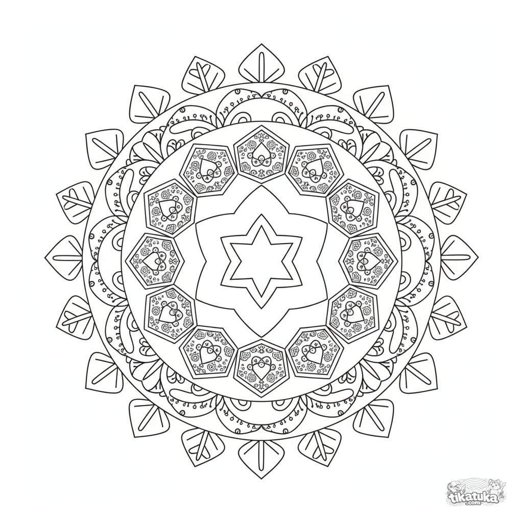 Komplexe geometrische Mandala-Ausmalbild für 10-12 Jahre. Achtzackiger Stern in der Mitte, Ringe aus Sechsecken und Rauten, symmetrisches Muster.