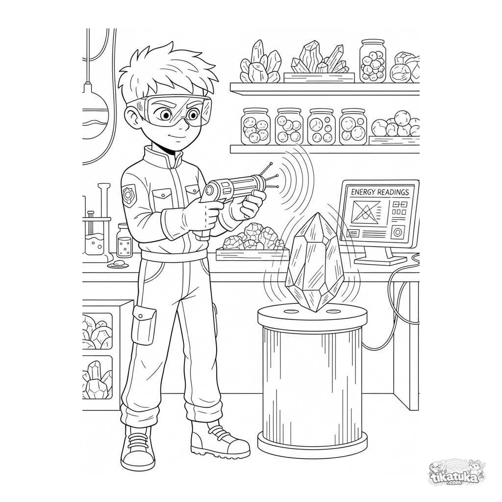 Ausmalbild für Kinder 10-12: Ein Erfinderlehrling in einem geheimen Labor untersucht die Energie eines mysteriösen Kristalls mit einem Scanner. Detaillierte wissenschaftliche Szene.