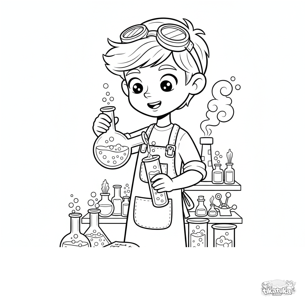 Ausmalbild für Kinder 4-6: Ein Erfinderlehrling mischt vorsichtig leuchtende Tränke in Kolben in einem geheimen Labor.