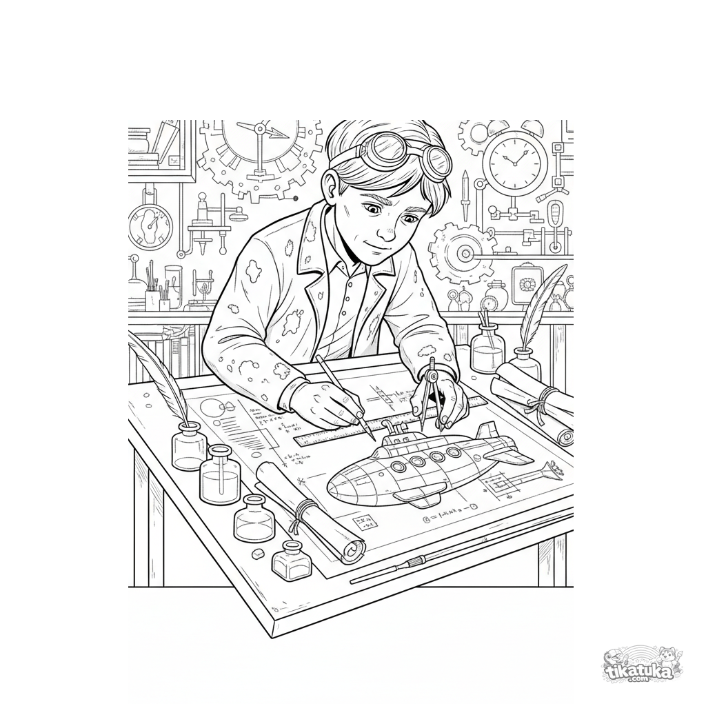 Ausmalbild für ältere Kinder 10-12: Ein Erfinderlehrling im Geheimlabor zeichnet einen detaillierten Bauplan für ein Flug-U-Boot. Zeichentisch, Zirkel, Lineal, Pergamentrollen.
