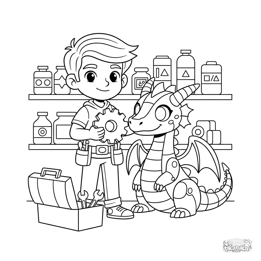 Ausmalbild für Kinder 7-9: Ein Jungen-Erfinder und sein treuer mechanischer Drache in einem geheimen Labor.