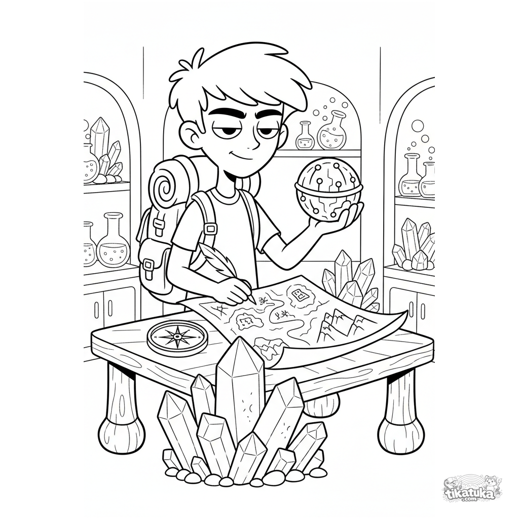 Ausmalbild für Jungen 7-9: Ein junger Erfinder-Entdecker in einem geheimen Labor kartiert eine mysteriöse Kristallformation.