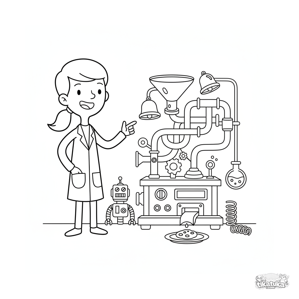 Ausmalbild für Kinder 7-9: Ein junger Erfinder präsentiert stolz seine lustige automatische Keksspender-Maschine im Geheimlabor.