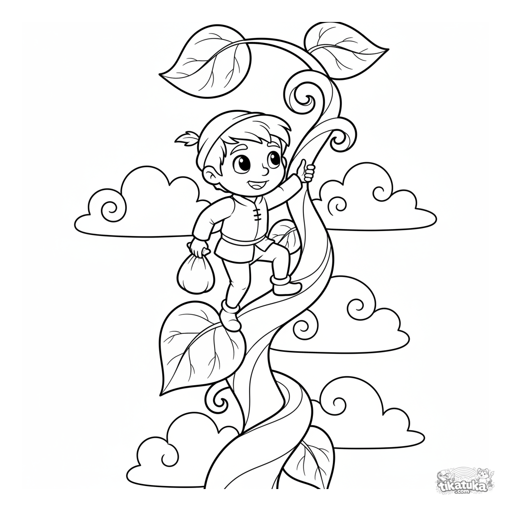 Ausmalbild für Kinder 4-6 aus dem Märchen: Jack klettert an einer riesigen Bohnenranke in den Himmel.