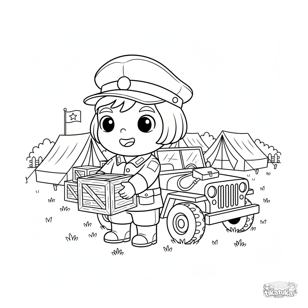Ausmalbild für Kinder 4-6: Ein Soldat lädt Kisten von einem Militär-Jeep in der Nähe eines Feldhauptquartiers mit Zelten ab.