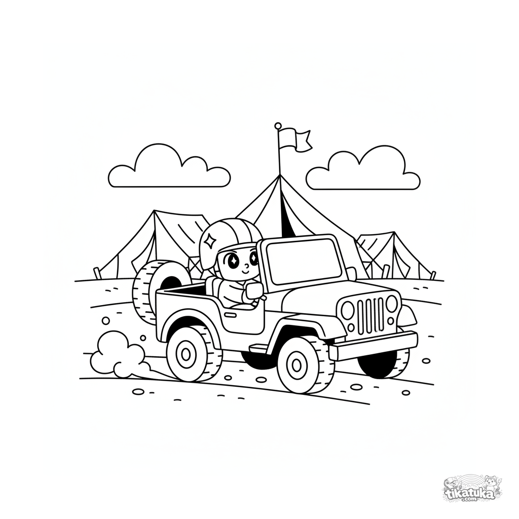 Ausmalbild für Kinder 4-6: Ein Militär-Jeep fährt auf einer Schotterstraße in der Nähe von Feldhauptquartier-Zelten. Ein fröhlicher Fahrer am Steuer.