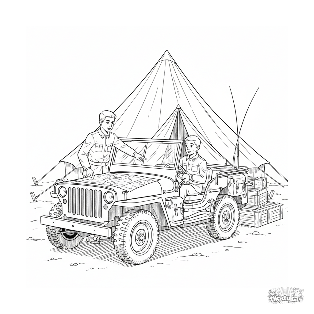 Detailliertes Ausmalbild im Vintage-Stil für 10-12 Jahre: Ein Kommandant hält eine Besprechung ab und nutzt die Motorhaube eines Jeeps als Tisch, nahe einem Feld-HQ. Saubere gravurartige Linienführung.