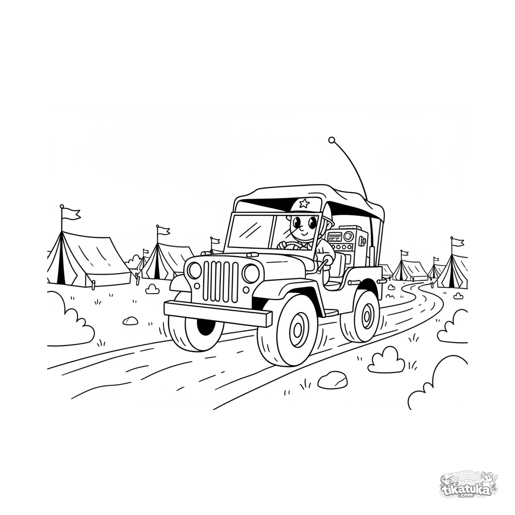 Ausmalbild für 7-9 Jahre: Ein Retro-Funk-Jeep fährt langsam einen Weg zwischen den Zelten eines Feldhauptquartiers entlang. Alter Cartoon-Stil.
