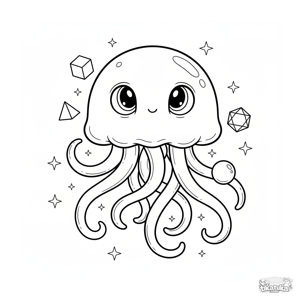 Ausmalbild für Tweens 7-9: Ein anmutiges, quallenähnliches Alien schwebt friedlich zwischen Sternen, begleitet von schwebenden Kristallen in einer magischen Weltraumszene.