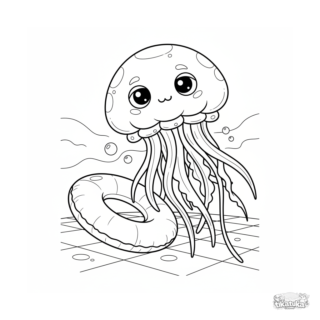 Ausmalbild für Kinder von 7-9 Jahren: Eine sanfte Qualle treibt nahe einem Schwimmring. Mäßiges Detail, ausdrucksstarke, fließende Formen.
