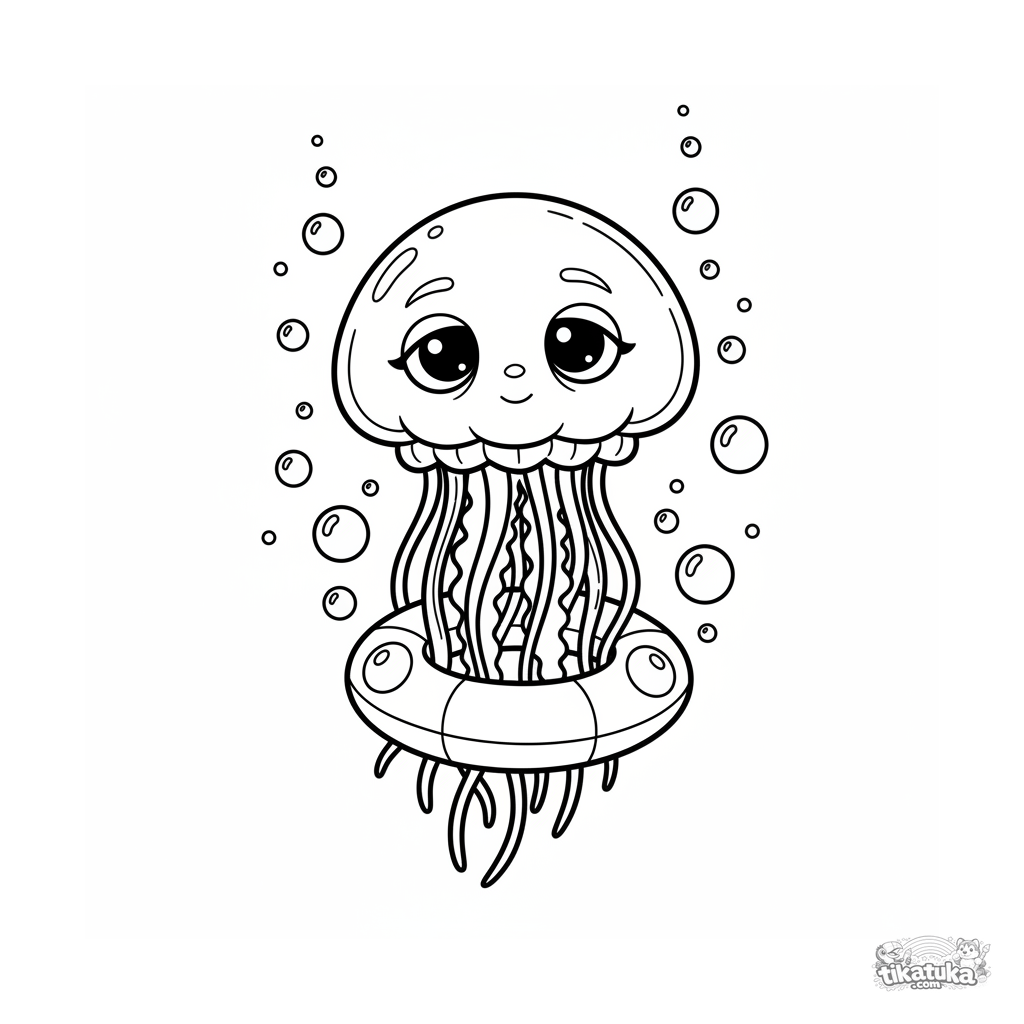 Ausmalbild für Kinder 7-9: Eine sanfte Qualle schwebt im Wasser über einem aufblasbaren Ring am Beckenboden, umgeben von einem Blasengarten. Mittlere Detailstufe.