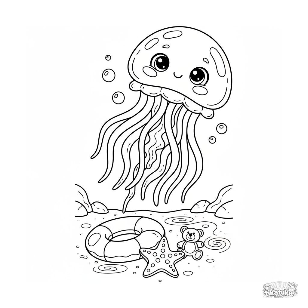 Ausmalbild für Kinder von 7-9 Jahren: Eine sanfte Qualle schwebt über Schwimmspielzeug am Poolboden. Szene mit fließenden Linien und mittlerem Detailgrad.