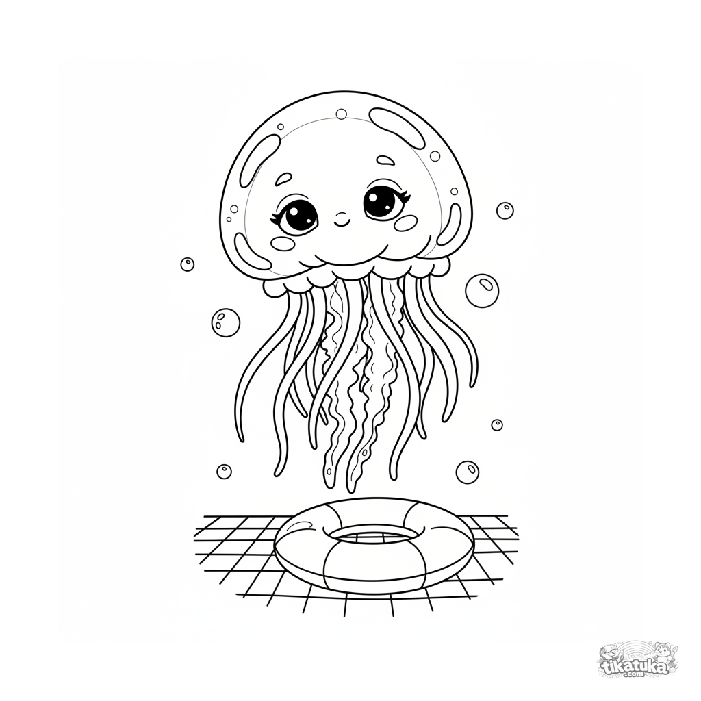 Ausmalbild einer sanften Qualle, die über einem Schwimmring am Poolgrund schwebt. Für Kinder von 4 bis 6 Jahren.